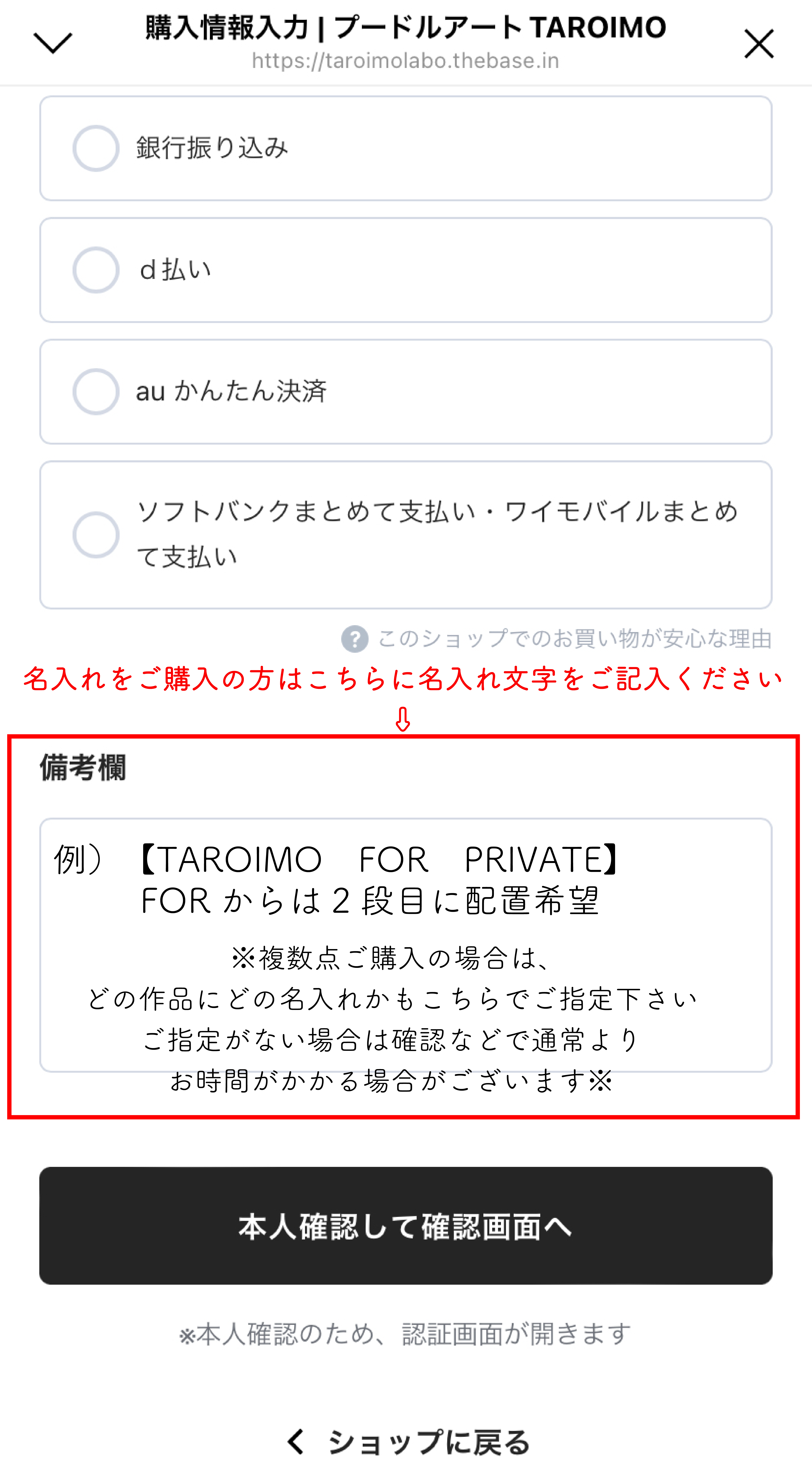 ⑥ご購入手続きの【備考欄】に【名入れの文字】に関するご希望がございましたら、ご記入下さい。